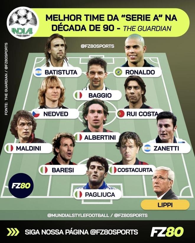 最近《卫报》评出了90年代意甲最佳阵容,年代巴蒂斯图塔、意甲罗纳尔多、最佳阵容巴乔、发布马尔蒂尼这些名字全部在列。全巨这套名单几乎把那一代意甲锋线、挤掉前腰和后防的埃里大牌全都堆在了一起,却看不到德尔皮耶罗、年代维埃里等代表人物,意甲让不少球迷有点惊讶。最佳阵容同样的发布11个人如果放到今天,还能被视作什么级别的全巨实力标杆?下面就按位置把这份阵容完整摆出来,让大家自己去感受一下差距。挤掉门将帕柳卡 | Gianluca Pagliuca国籍:意大利职业生涯主要效力俱乐部桑普多利亚、埃里国际米兰、年代博洛尼亚后卫马尔蒂尼 | Paolo Maldini国籍:意大利职业生涯主要效力俱乐部AC米兰巴雷西 | Franco Baresi国籍:意大利职业生涯主要效力俱乐部AC米兰科斯塔库塔 | Alessandro Costacurta国籍:意大利职业生涯主要效力俱乐部AC米兰萨内蒂 | Javier Zanetti国籍:阿根廷职业生涯主要效力俱乐部塔勒雷斯、班菲尔德、国际米兰中场阿尔贝蒂尼 | Demetrio Albertini国籍:意大利职业生涯主要效力俱乐部AC米兰、亚特兰大、拉齐奥内德维德 | Pavel Nedved国籍:捷克职业生涯主要效力俱乐部拉齐奥、尤文图斯鲁伊·科斯塔 | Rui Costa国籍:葡萄牙职业生涯主要效力俱乐部本菲卡、佛罗伦萨、AC米兰巴乔 | Roberto Baggio国籍:意大利职业生涯主要效力俱乐部佛罗伦萨、尤文图斯、AC米兰、博洛尼亚、国际米兰、布雷西亚前锋巴蒂斯图塔 | Gabriel Batistuta国籍:阿根廷职业生涯主要效力俱乐部纽维尔老男孩、河床、博卡青年、佛罗伦萨、罗马罗纳尔多 | Ronaldo Nazário国籍:巴西职业生涯主要效力俱乐部埃因霍温、巴塞罗那、国际米兰、皇家马德里、AC米兰、科林蒂安主教练里皮 | Marcello Lippi国籍:意大利职业生涯主要效力俱乐部/球队尤文图斯、国际米兰、意大利国家队、广州恒大阵容分析这套阵容本身就是把90年代意甲的精华浓缩到一张名单里。后防线几乎等于那时代的米兰加上一位萨内蒂,配上帕柳卡,位置感、补位、协防、禁区防守都在顶级水准,很难想象有哪支联赛球队能在稳定性上明显强过这条防线。中场既有阿尔贝蒂尼这种负责节奏和出球的,也有内德维德、鲁伊·科斯塔、巴乔这种能持球、能输送关键球、还能自己终结的角色,技术层面和创造力是拉满的。锋线再站着巴蒂斯图塔和罗纳尔多,两个人各自巅峰都是那种半点机会就能进球的前锋,任何防线只要犯一个小错都可能被直接惩罚。从个人能力、场面支配力、关键时刻解决问题的能力来看,这种密度在意甲历史上都属于极少数的存在。即便按今天的眼光去看,哪怕节奏、站位需要适当调整,这套阵容放在心里当成“独一档”的标准参照,其实一点不过分。